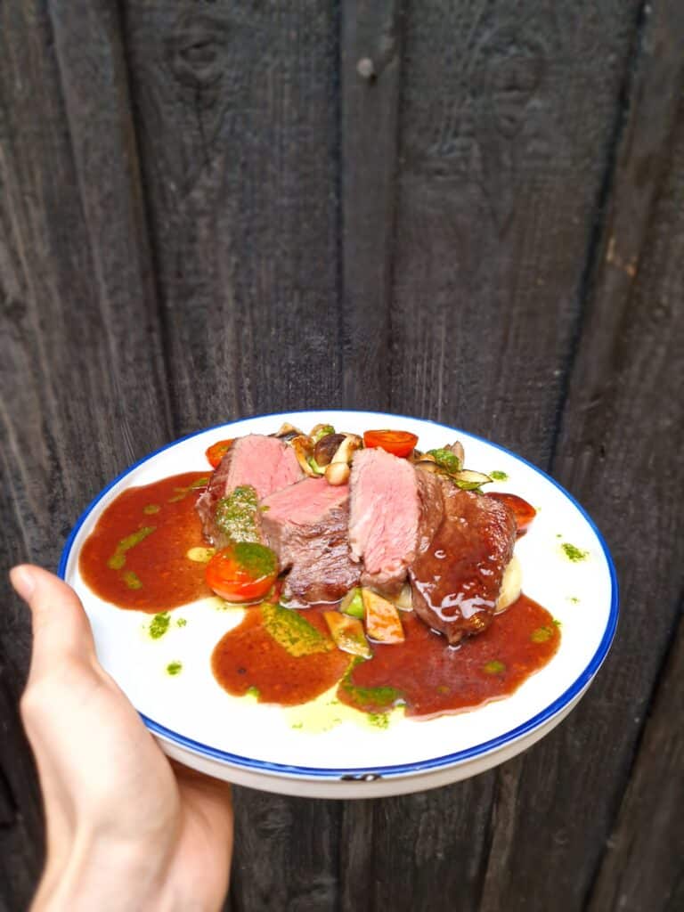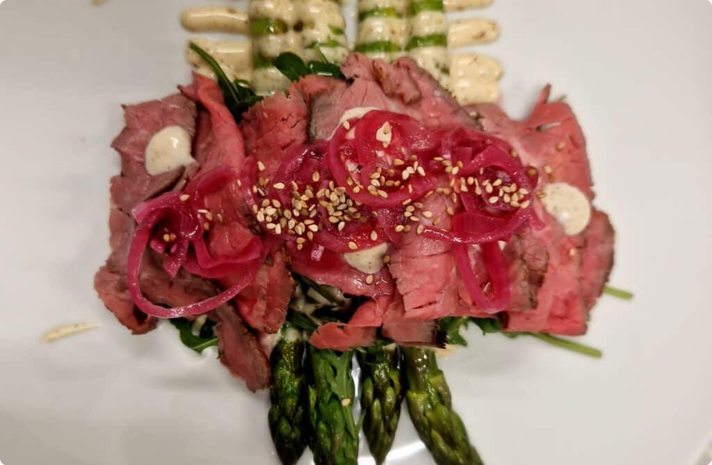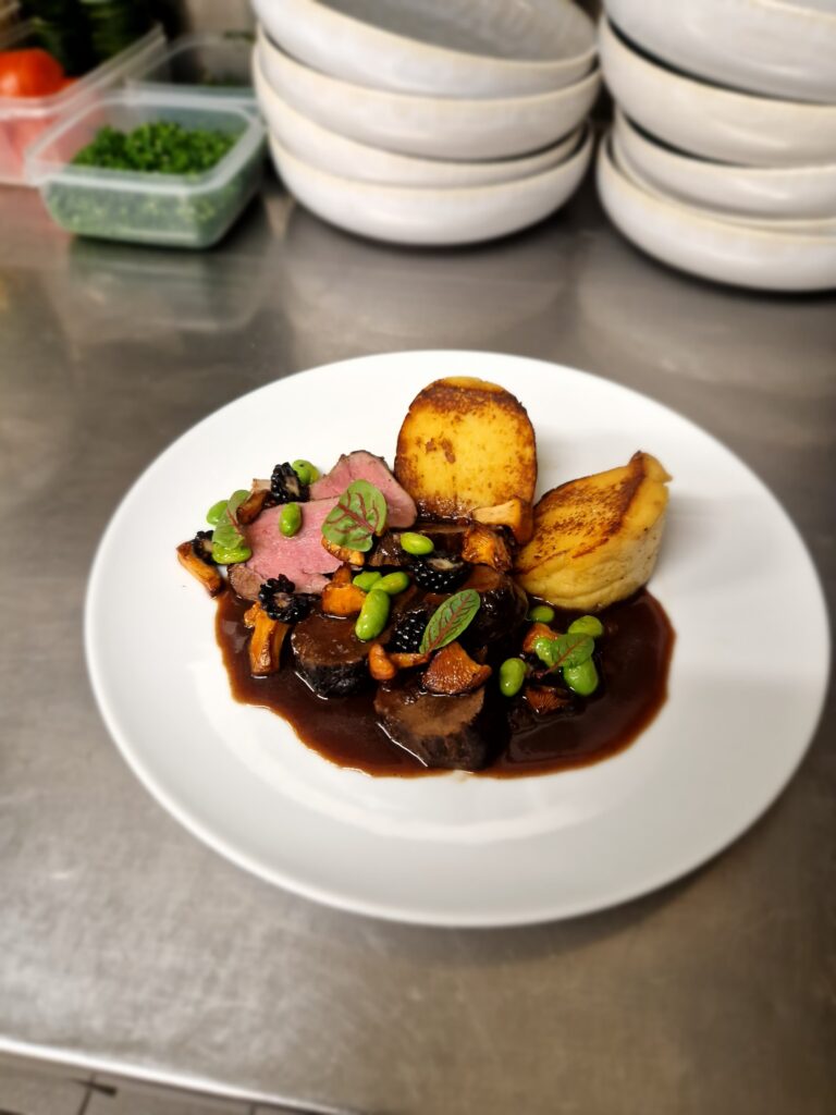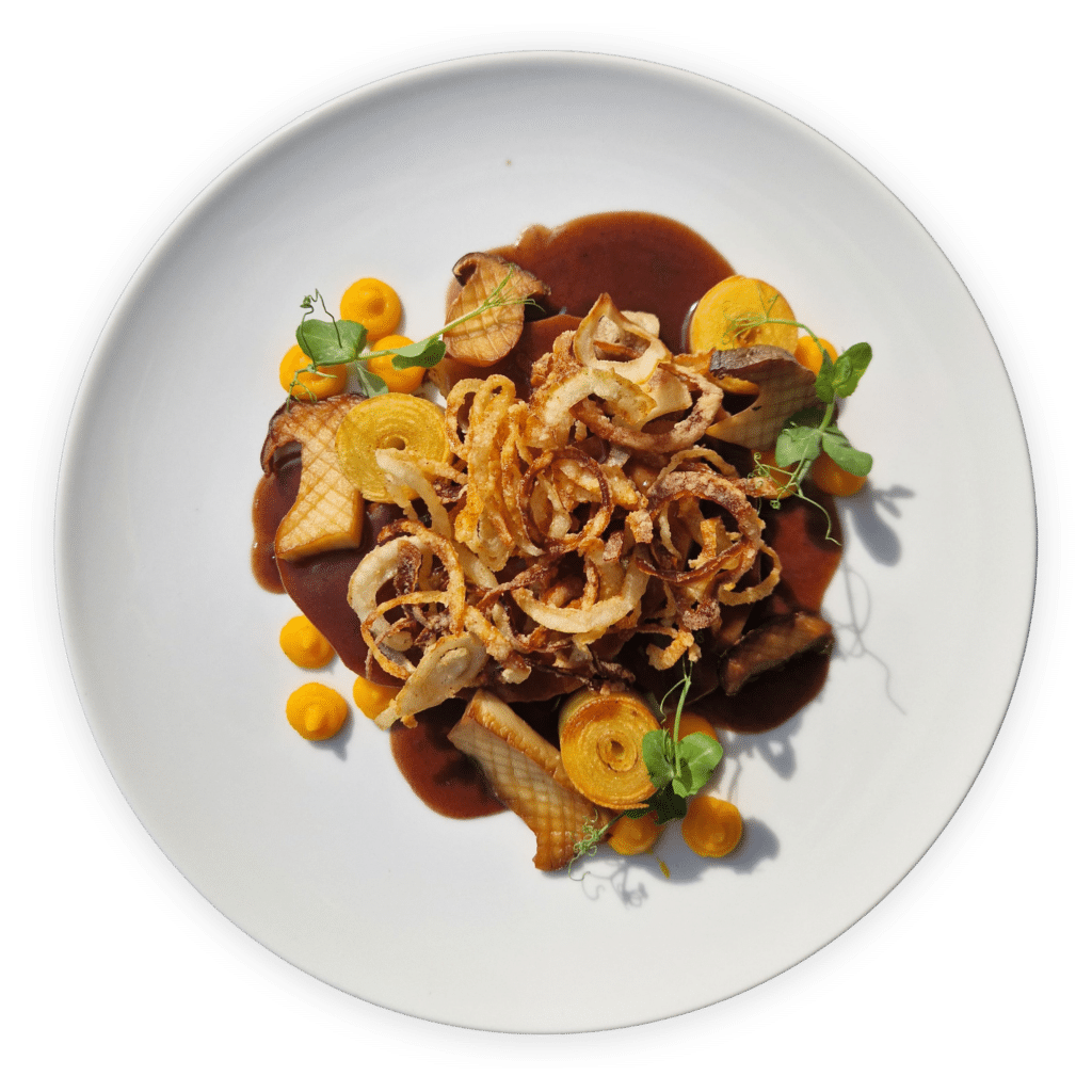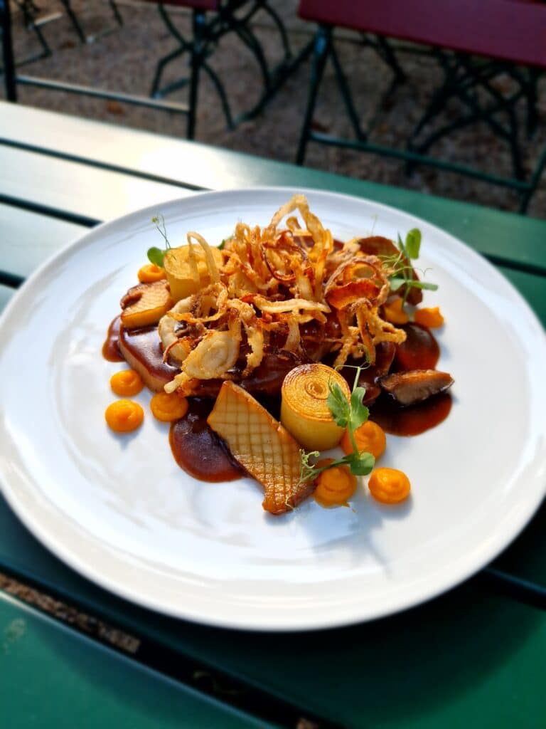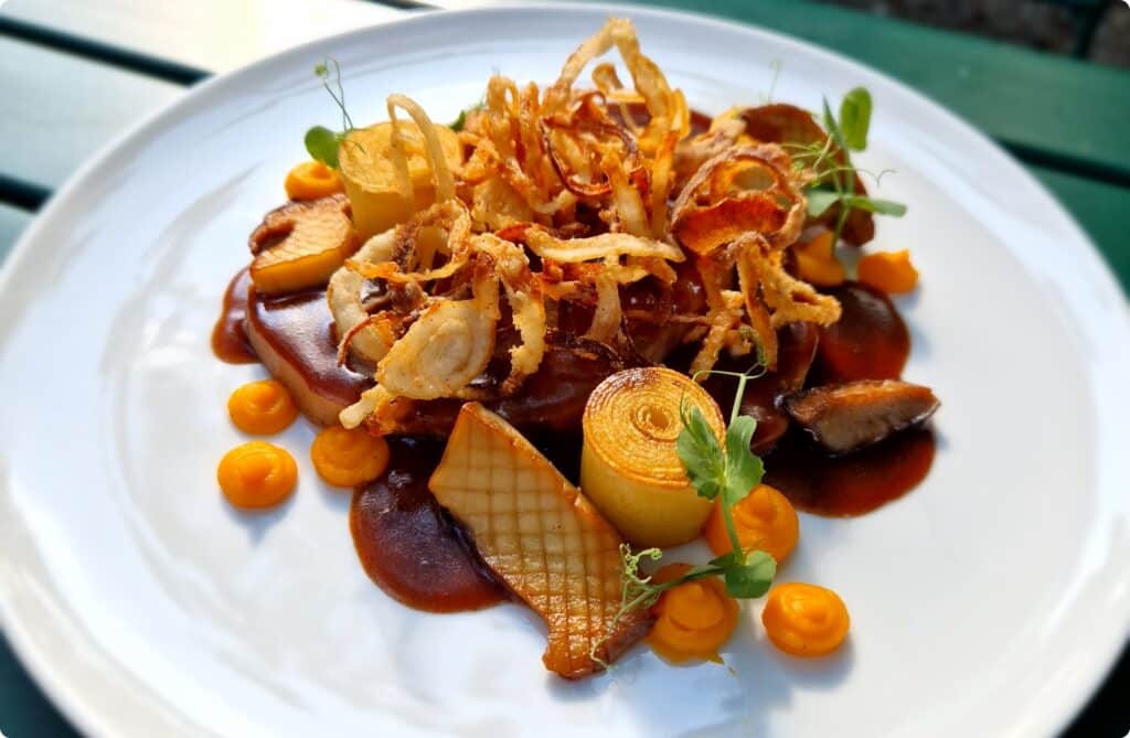 mit Räucherfischcreme, Rucola, Grana, eingelegter Kürbis und Kapern16,50geschmortes Schulterscherzel vom Jungrind